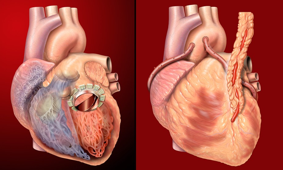 ant-hearts-copyright-lynch-2007 Various anterior views of the heart. Artificial mitral valve in place, and bypass grafts in place. Photoshop illustrations. Patrick Lynch on January 22, 2017