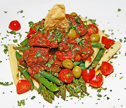 A slow-cooked beef chili with the accent on tomatoes, and finished with fresh vegetables. Serve it with kidney beans and rice if you must, but I much prefer a bed of green beans, fresh baby corn, asparagus or other veggies. This recipe just fits a 4 quart slow cooker.