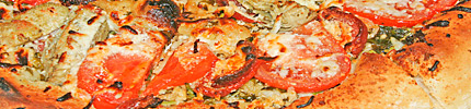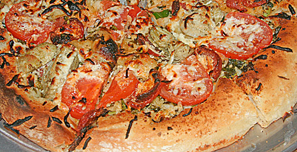 So, a variation on a classic fresh tomato-and-basil margherita pizza, with some strategic additions and substitutions of ingredients that you can get virtually anywhere in the U.S., and that you can easily make in a home oven.