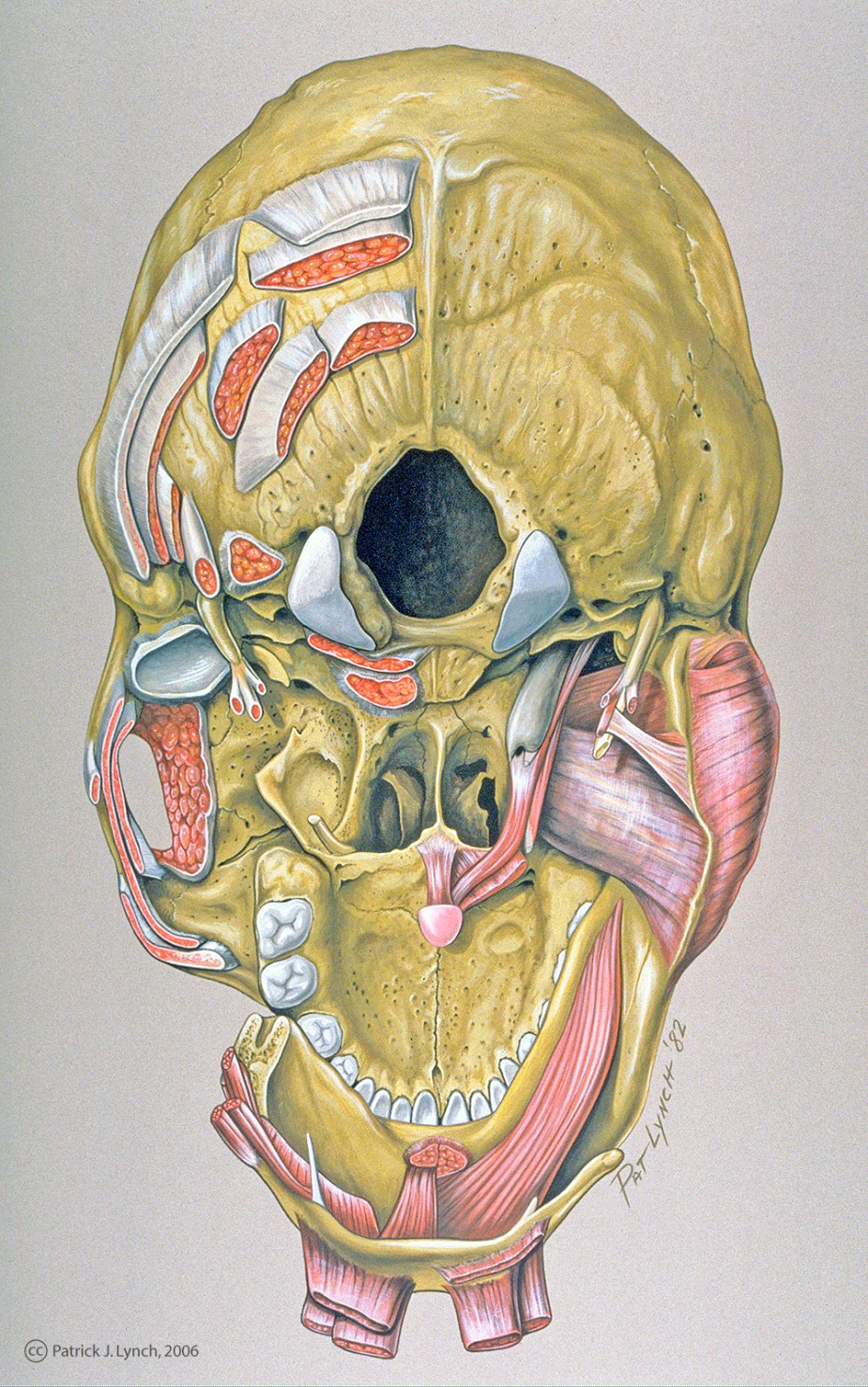 skull_base_anatomy-copyright-lynch-2007 Anatomy of the skull base muscular attachment points. Gouache on board. Patrick Lynch on January 22, 2017